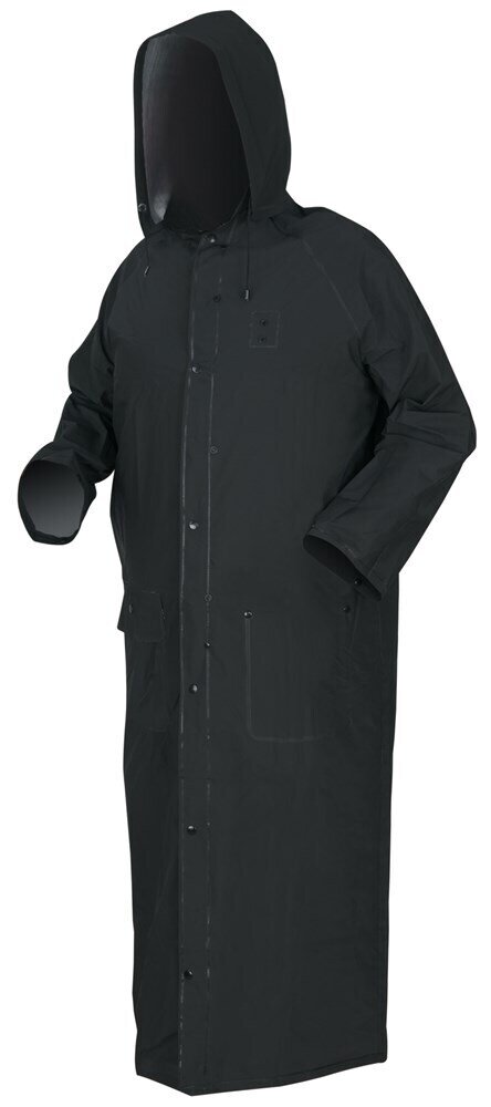 The Classic Plus Series rain gear is made of the most popular material in the Industry. It combines the strength and waterproof qualities of PVC with the durability of a polyester backing. The 267C long black raincoat is 60 inches in length (Large) and features a snap front, take up snaps at the wrists, detachable hood with drawstring, corduroy collar, cape vented back, 1 inner pocket and 1 outer pocket. This coat splits in the back and can snap around each leg to form chaps. If you are looking for the best raincoat options, look no further than MCR Safety!