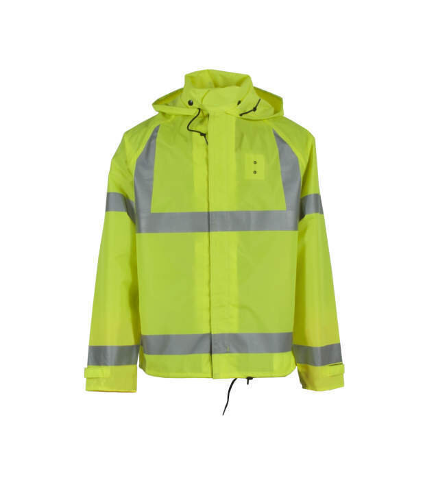 • 200 Denier Polyurethane Coated Polyester ASTMD 6413 Fire Resistant 2" Silver 3M™ Scotchlite™ Reflective Film ANSI/ISEA 107-2004 Class 3 30" Long Jacket Tuck Away Roll Up Hood Raglan Shoulder Design with Take-Up Tabs Storm Flap with Zipper Front, Snaps and Hook and Loop Closure Drawstring Sweep
